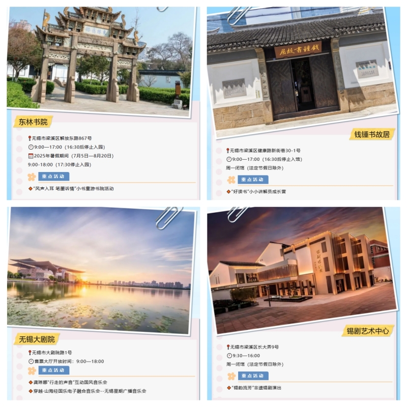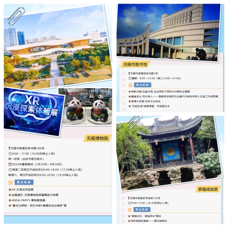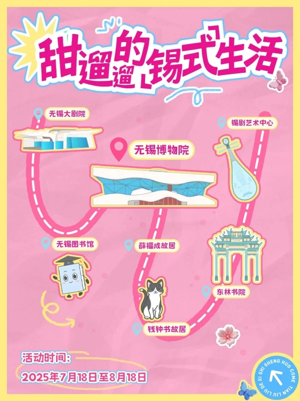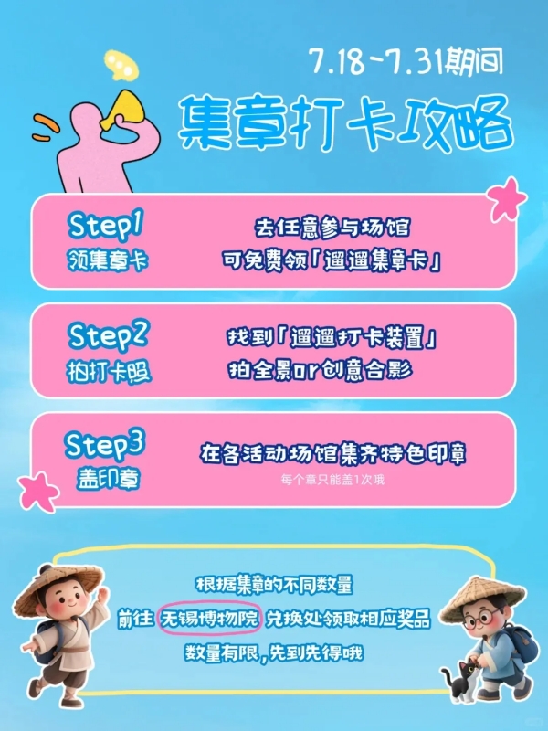 1、7月18日至7月31日,前往無錫博物院、無錫市圖書館、薛福成故居、東林書院、錢鍾書故居、無錫大劇院、錫劇藝術(shù)中心任一場(chǎng)館領(lǐng)取「遛遛集章卡」。