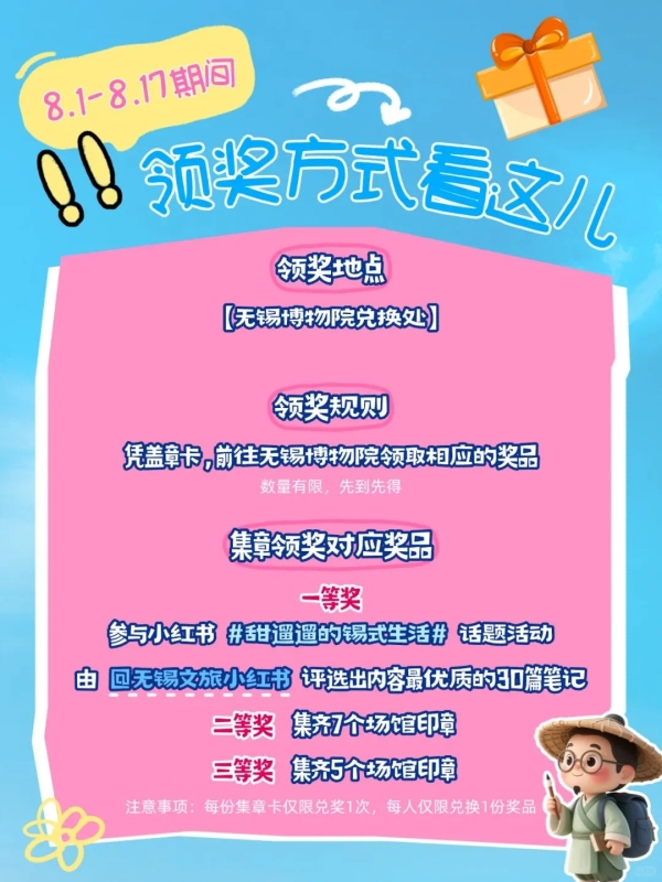領(lǐng)獎(jiǎng)規(guī)則:憑蓋章卡,前往無錫博物院領(lǐng)取相應(yīng)的獎(jiǎng)品,獎(jiǎng)品數(shù)量有限,先到先得!