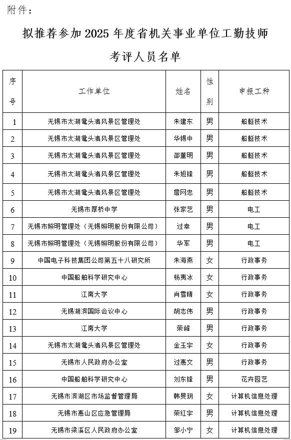 根據(jù)省人力資源社會(huì)保障廳《關(guān)于印發(fā)<江蘇省機(jī)關(guān)事業(yè)單位工勤技能崗位技術(shù)等級(jí)考評(píng)實(shí)施意見>的通知》(蘇人社發(fā)〔2024〕44號(hào))、《省人力資源社會(huì)保障廳關(guān)于做好2025年全省機(jī)關(guān)事業(yè)單位工勤技能崗位技術(shù)等級(jí)考評(píng)工作的通知》(蘇人社函〔2025〕37號(hào))以及《關(guān)于做好2025年全市機(jī)關(guān)事業(yè)單位工勤技能崗位技術(shù)等級(jí)考評(píng)工作的通知》(錫人社函〔2025〕12號(hào))的文件精神,經(jīng)個(gè)人申報(bào)、專家推薦,單位和主管部門初審、量化考評(píng)、擇優(yōu)推薦,各市(縣)、區(qū)工考辦審核、市級(jí)復(fù)核和選拔考試等程序,擬推薦符合申報(bào)條件的人員共64人參加省技師培訓(xùn)考評(píng)。(詳見附件),現(xiàn)予以公示。