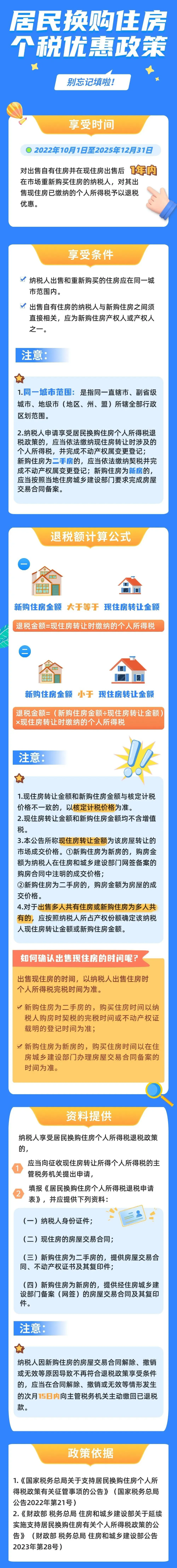 根據公告,對出售自有住房并在現住房出售后1年內在市場重新購買住房的納稅人,對其出售現住房已繳納的個人所得稅予以退稅優(yōu)惠,公告執(zhí)行至2025年底。