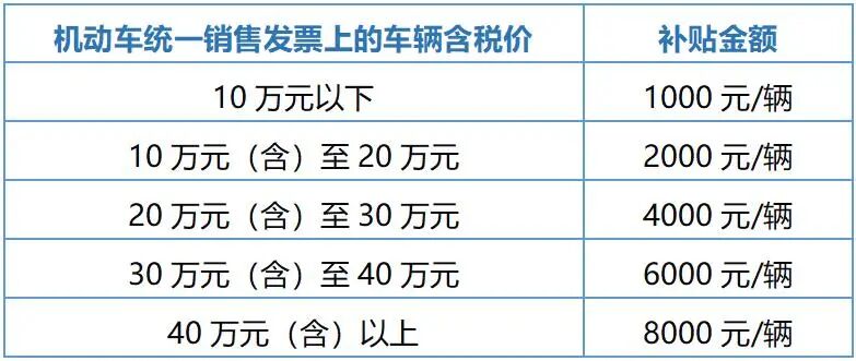 審核通過后,按機動車銷售統(tǒng)一發(fā)票上的購車價格(含稅價),分別給予一次性補貼。