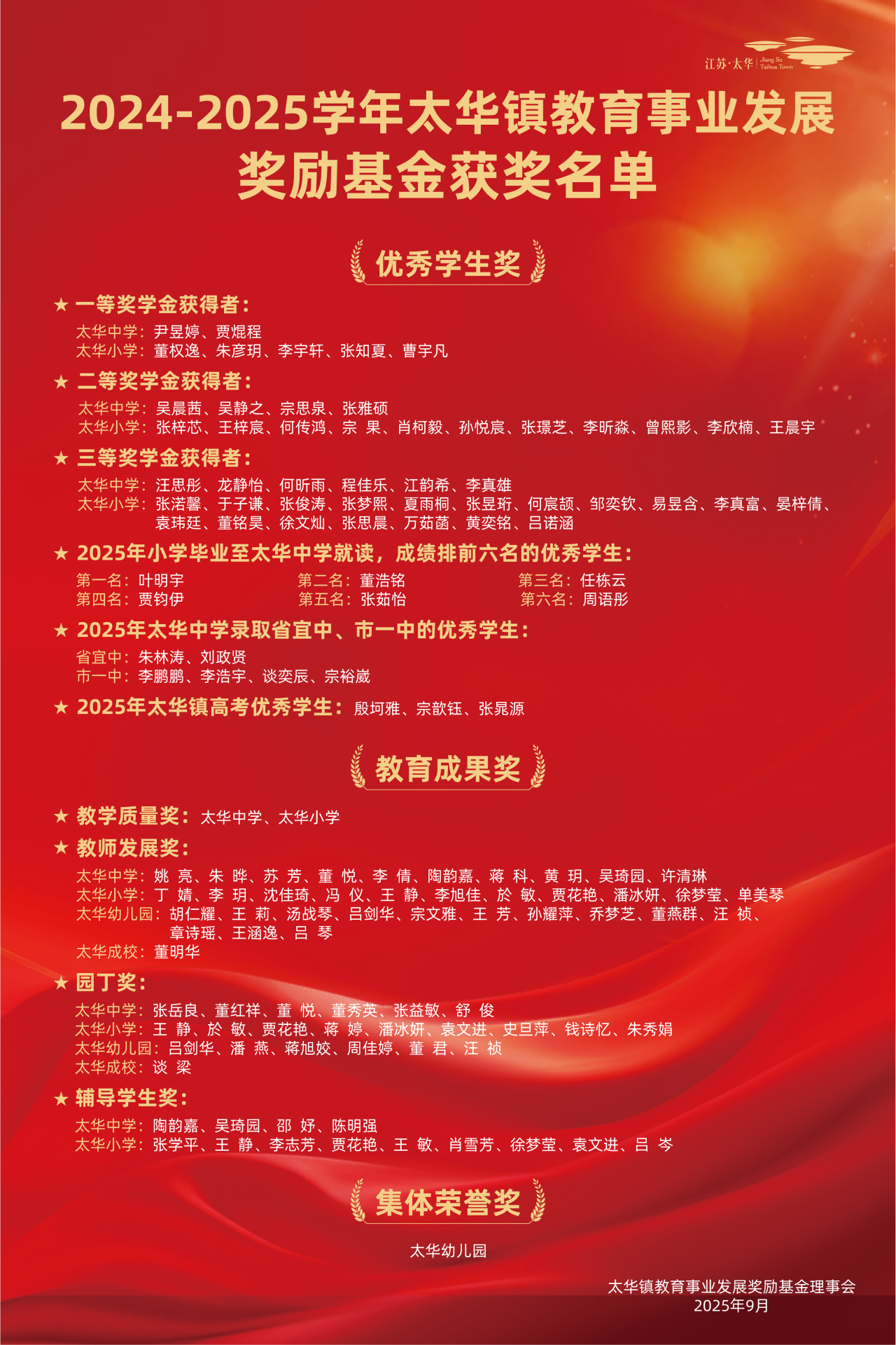 9月9日,2025年太華鎮(zhèn)教育事業(yè)發(fā)展獎勵基金頒獎大會召開,為2024—2025學(xué)年對太華教育事業(yè)發(fā)展作出重要貢獻的學(xué)校、取得優(yōu)異成績的在校學(xué)生及教學(xué)成效顯著的教師頒發(fā)獎勵基金。度假區(qū)黨工委委員、太華鎮(zhèn)黨委書記潘國強,太華鎮(zhèn)鎮(zhèn)長、黨委副書記盛幼群,市教育局副局長嚴俊,太華鎮(zhèn)副鎮(zhèn)長姚楓,太華鎮(zhèn)教育基金常務(wù)副理事長孫國強參加活動。